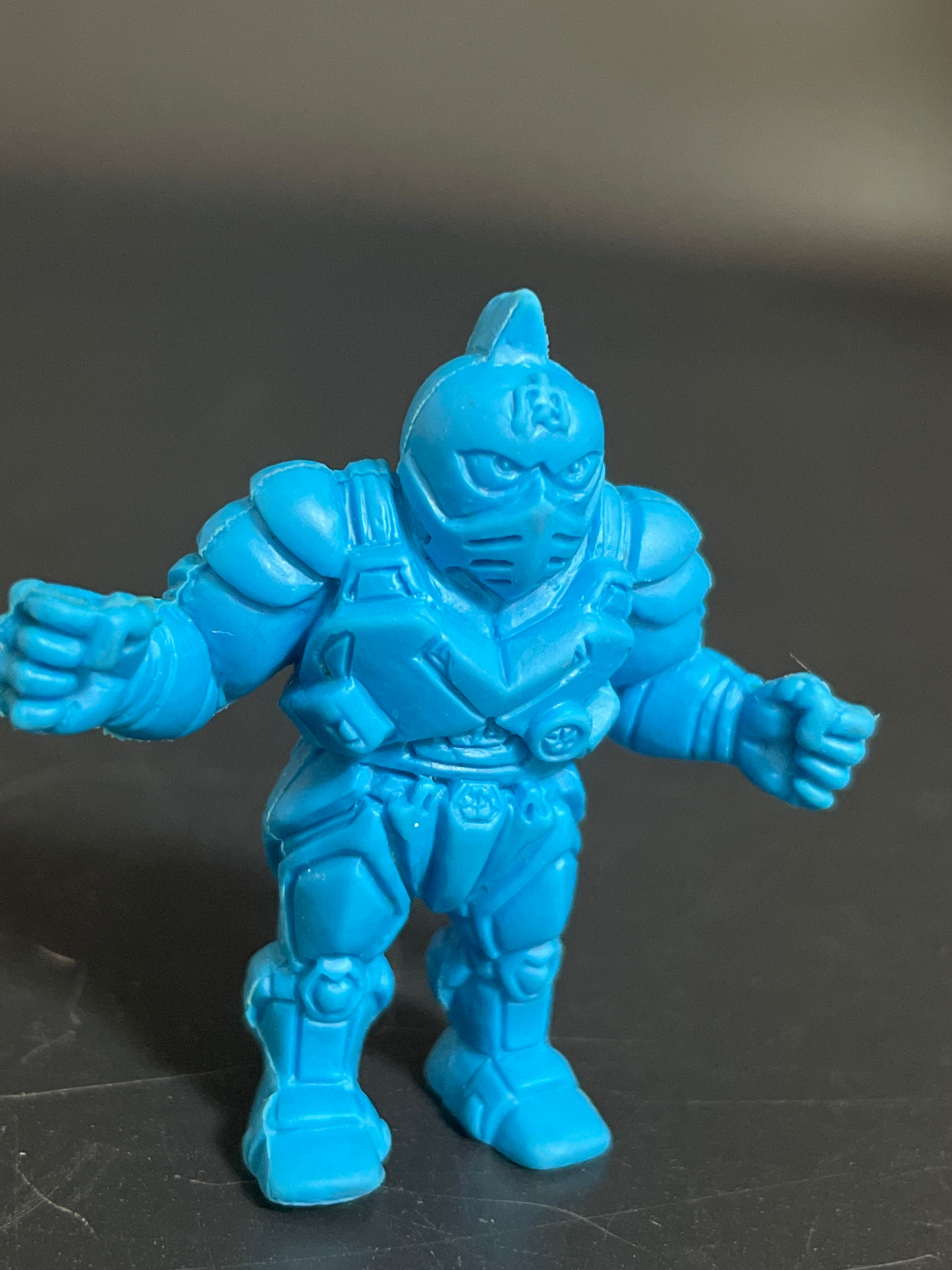 中古品です。背面の左肩に赤い色移りというか点があります。背面の右肘にもシミがあります。また正面のマスクの鼻先辺りが黒ずんでいます。古い商品なので完品ではありません。画像をよく見て判断してください。