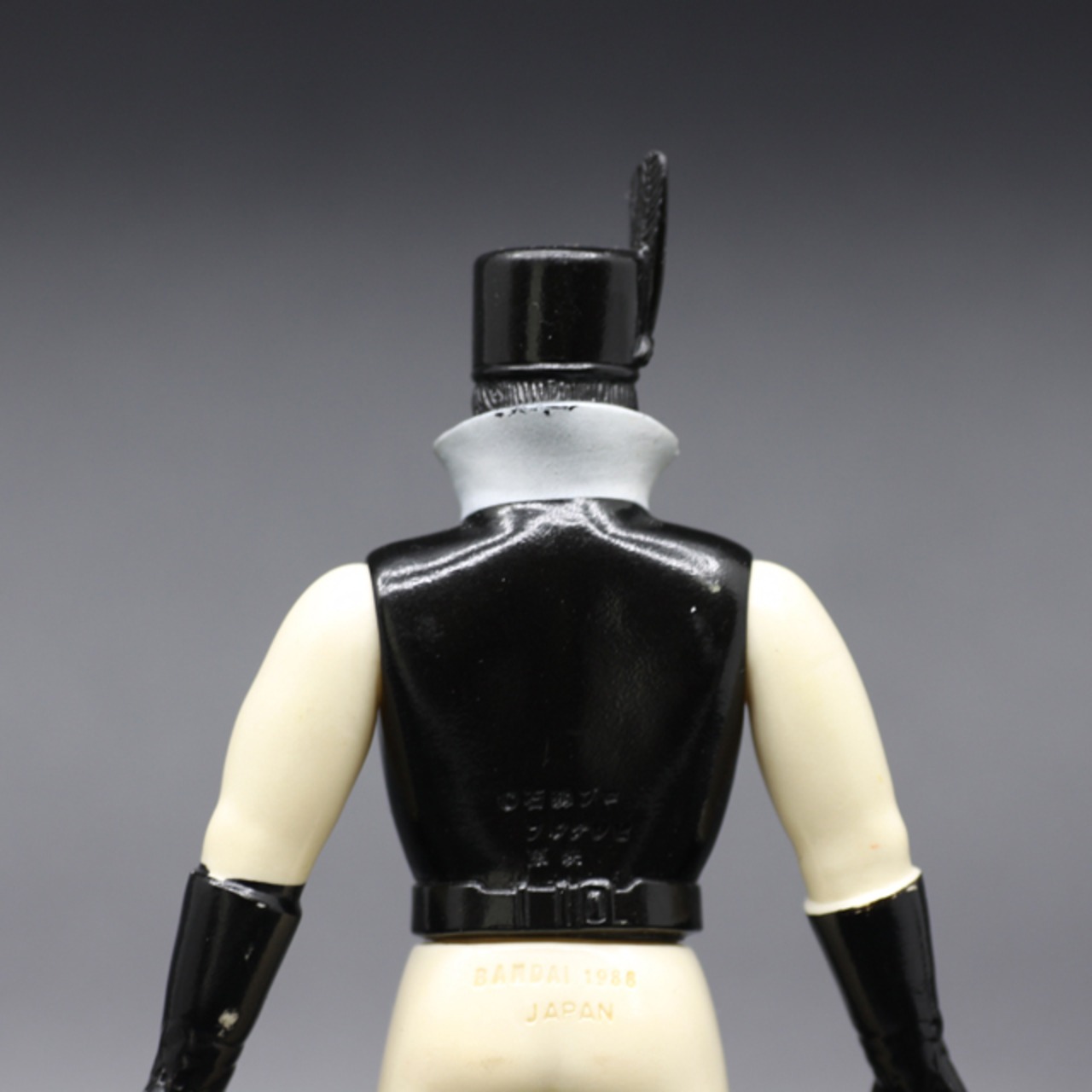 1988年にフジテレビ系で放送されたドラマ「じゃあまん探偵団魔隣組」に登場する大怪盗ジゴマのソフビです。完品ではマント、ステッキ、コマが付属しているのですが本商品は欠品していて本体のみとなります。